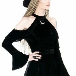 Be the first to review “Restyle Dresses Velvet Black Gothic Crescent Cold-Shoulder Mini Dress” Cancel reply