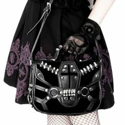 Gothic, small handbag made of black suede. The flap of the bag is decorated with a coffin lid. Numerous stitching and harness stripes made of artificial leather emphasize the gothic style. Metal elements and fittings add edgy character. The flap is fastened with a magnetic clasp and, for the safety of your belongings, additionally threaded through a strip.