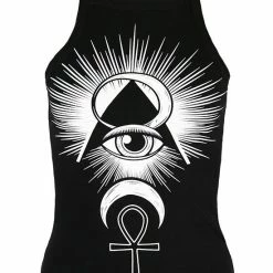 There is a big printing with third eye in pyramid, crescent moon and ankh cross.