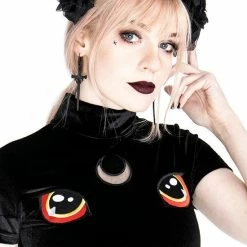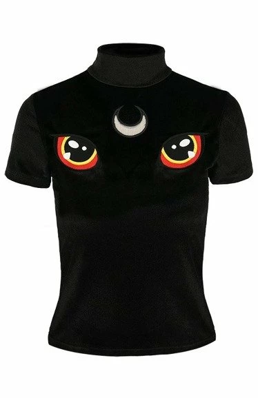 There is a big embroidery of cat’s eyes and a crescent moon.