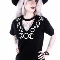 Blouse made of strong, black cotton. Oversized fit with a V-neck neckline and a choker.